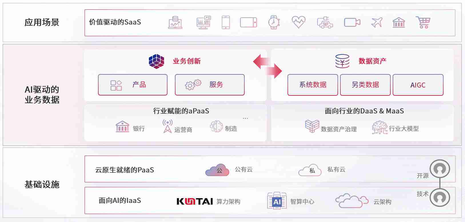 数字时代,,,,围绕企业数字化转型的关键要素,,,AG尊龙数码开创性的提出数云融合战略和技术体系框架,,,,着力在云原生、、数字原生、、AI原生和信创产业上架构产品和服务能力,,,,为处在不同数字化转型阶段的快消零售、、汽车、、、、金融、、、医疗、、政企、、、教育、、、、运营商等行业客户提供泛在的敏捷IT能力和融合的数据驱动能力,,构建跨界融合创新的数字业务场景和新业务模式,,,,助力企业级客户建立面向未来的核心能力和竞争优势,,,,全面推动社会的数字化、、智能化转型升级。。。。